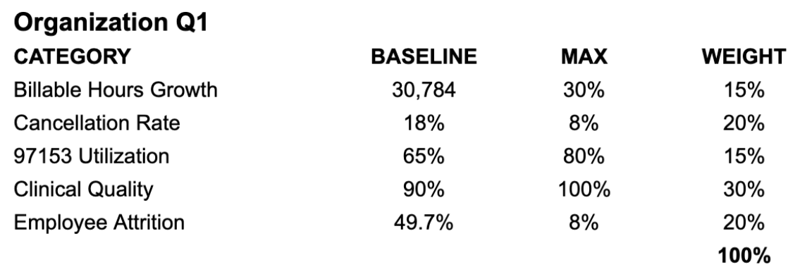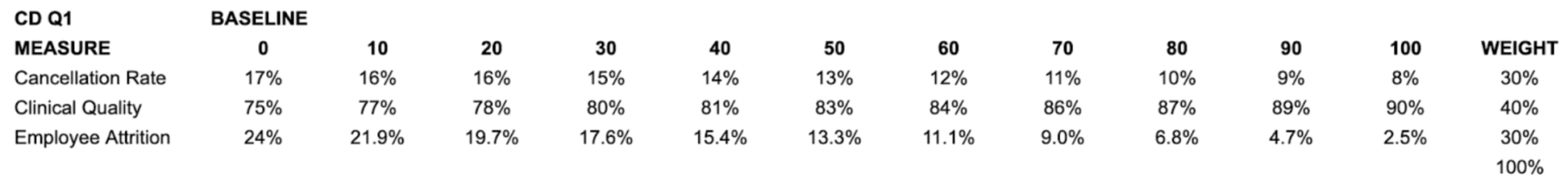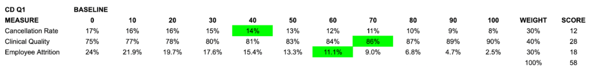 There’s a better way. Drawing on Organizational Behavior Management (OBM), we built a simple system that ties controllable role metrics to a stepwise target ladder, assigns weights that mirror strategy, and pays out fast when teams make progress. The effect: higher clinical quality, fewer cancellations, and lower attrition—without fear tactics.